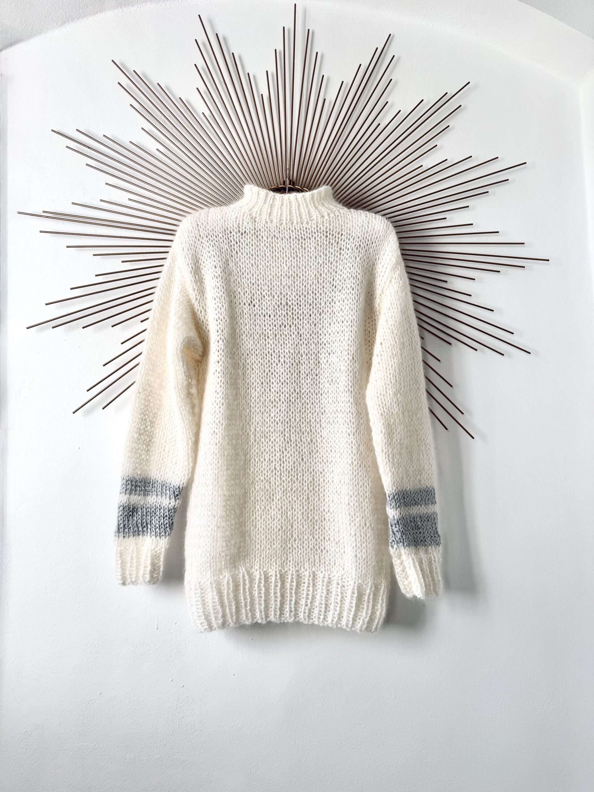 Dlouhý svetr s nízkým rolákem Stříbrný úsvit nese stejné kouzlo. Smetanově bílý a éterický, protkaný jemnou stříbrnou nití na rukávech, působí čistě, klidně a přitom luxusně. Každý detail zachycuje světlo jako ranní mráz na sněhu – nenápadně, ale s dokonalou elegancí.